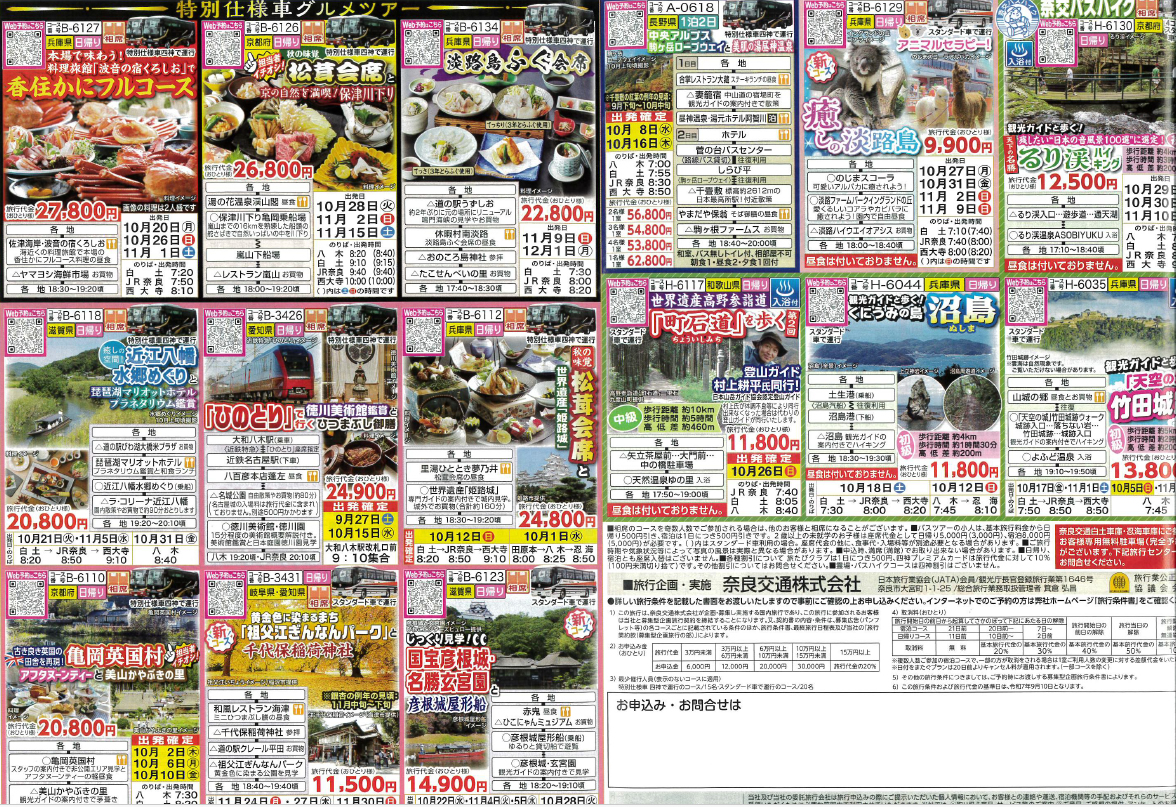 ホーム 当社について 業務内容 ‐グループ旅行手配 ‐少人数旅行手配 ‐社員研修・修学旅行 オンライン商談 特集キャンペーン おすすめの宿・食事処 よくあるご質問 会社概要 お知らせ&ブログ お問い合わせ プライバシーポリシー 標準旅行業約款 Top About Service Q&A Contact ホーム > 特集キャンペーン > 奈良交通ビューティフルツアー ~紅葉・秋グルメ~ 特集キャンペーン 奈良交通ビューティフルツアー ~紅葉・秋グルメ~ 2025.09.27 奈良交通ビューティフルツアー~紅葉・秋グルメ~ 9月27日から12月3日までの分を新しく掲載しました。 ビューティフルツアー~紅葉・秋グルメ1~(PDF) ビューティフルツアー~紅葉・秋グルメ2~(PDF) ひとつ前にもどる CONTACT US旅のご相談・お問い合わせはこちら メール問い合わせ tel.0743-62-6022 お急ぎの場合は、緊急連絡先:090-7760-3409<24時間対応>までご連絡ください。 緊急連絡先:090-7760-3409<24時間対応>